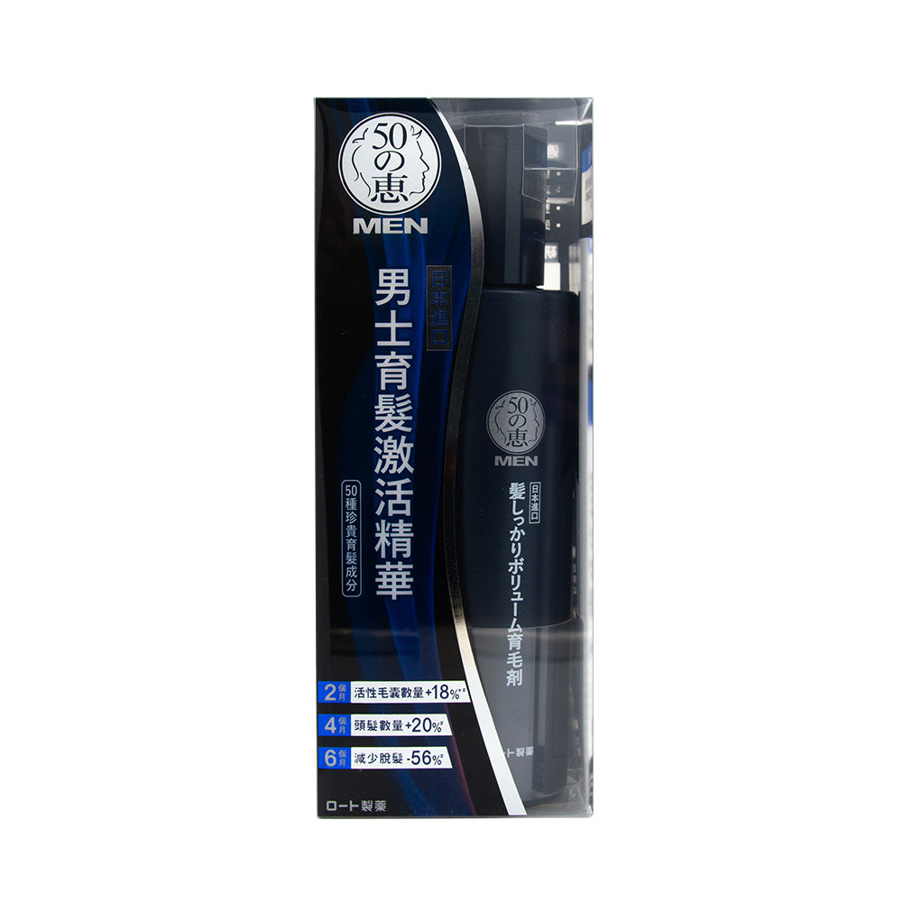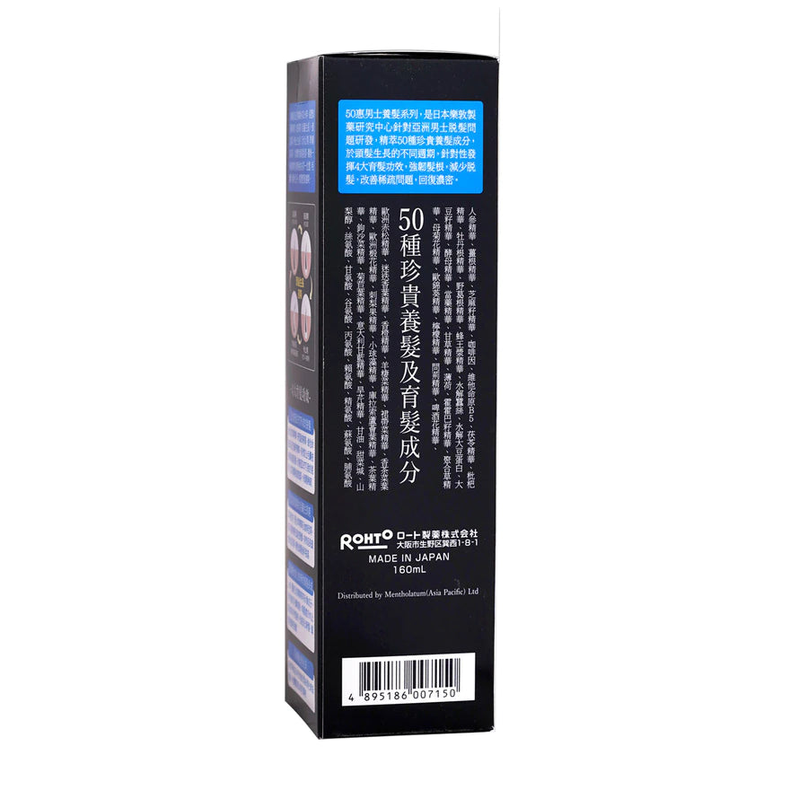 50惠男士養髮系列,是日本樂敦製藥研究中心針對亞洲男士脫髮問題研發,精萃50種珍貴養髮成分,於頭髮生長的不同週期,針對性發揮4大育髮功效,強韌髮根,減少脫髮,改善稀疏問題,回復濃密。