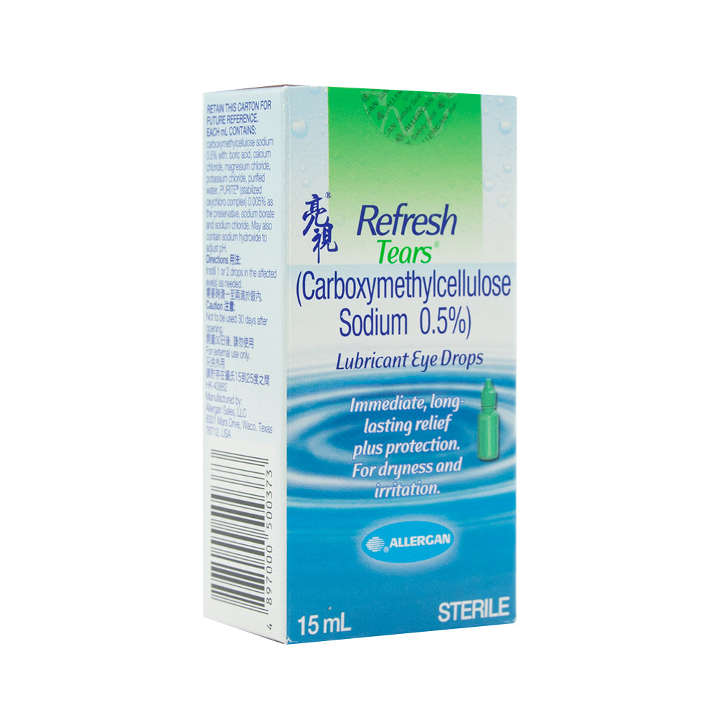 Refresh Tears®亮視含補濕因子CMC0.5%,可修復角膜細胞,有效即時滋潤眼睛,舒緩眼乾、眼睛刺激不適的徵狀。15毫升瓶裝可多次使用。所含的Purite®為一代防腐劑,可防止細菌滋生,衛生安全,並遇光快速分解為天然淚液,實驗證明可經常使用於眼睛,對比傳統的人工淚水防腐劑更為安全。